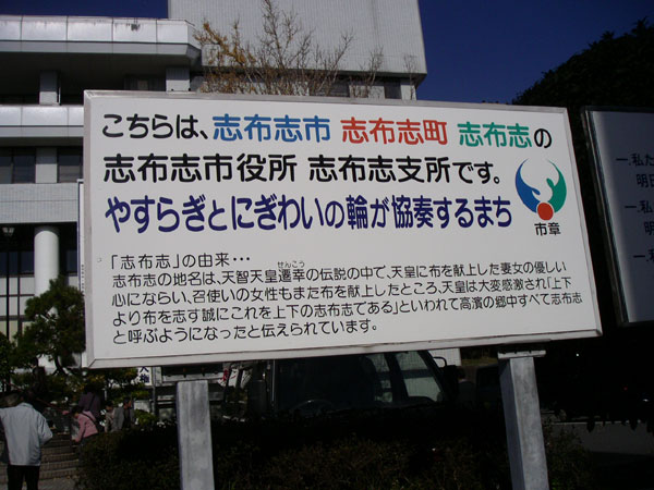 ▼フェリーで着いた志布志(しぶし)にあった看板。早口言葉になりそうだ。