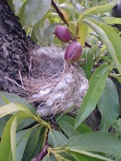 写真はネクタリンの樹に作られた鳥の巣。ここでよく見かけるカワラヒワの巣だろうか。すでに空だったが小さくてふわふわしていて可愛らしい。発見は作業中の楽しみ。