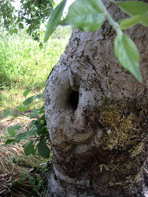 この辺にはフクロウこそいないが、摘果中にこの洞の中でヒナ鳥がピィピィ鳴いていることに気づいた。覗き込んでも中は暗くて何も見えない。しばらくすると親鳥と思われる2羽が同時にやって来て、周囲を警戒しながら交互に穴に首を突っ込んで餌を与え、またすぐに餌場へと飛んで行ってしまう。とても忙しそうだ。もう何日も繰り返しているのだろう。