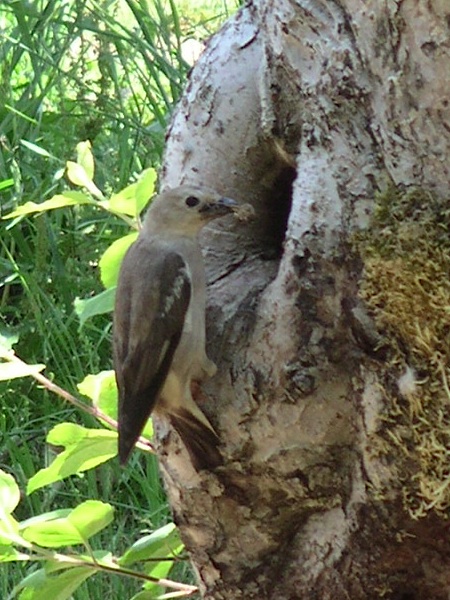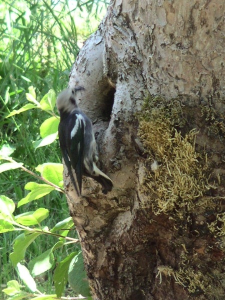 その鳥の名前を知りたくても動きが速くてよく見えない。そこで、手持ちのコンデジで撮影に挑み、何とか成功!!洞から2メートルほど離れた所に自転車を置き、丸見えなんだが一応その陰に隠れてカメラを構え、鳥たちに「動かない物」として見られるようただただ動かず5分以上(仕事シロ)。