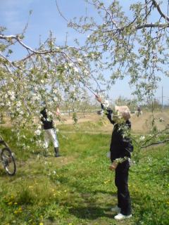 毎年ゴールデンウィーク終盤には終わっている授粉作業だが、今年は時期がずれた真っ只中に両親が愛知県から訪れた。親といえども農家が授粉を放棄して温泉宿に連れて行くことはできない。今回はちょうどバッティングして申し訳なかったが、せっかくだからと少し手伝っていただいた(笑)