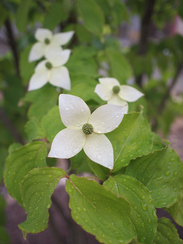 昨年移植したヤマボウシが花を咲かせた。雨に濡れた白さにうっとり。花の形が風車みたいだ。花好きというわけではないのだが、近頃は妙にカメラ好きである。