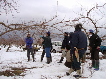 寒空の下、JA青年部の有志を中心に「剪定情報交換会」が行われた。