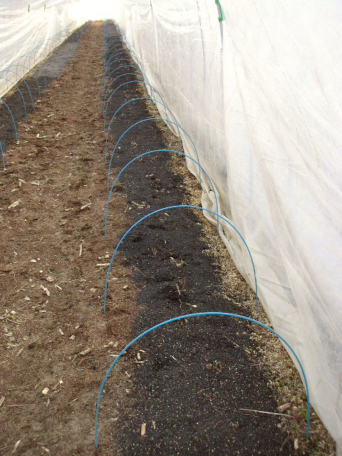 朝、地面の霜柱が融けないうちにまた1棟ビニールを掛けた。